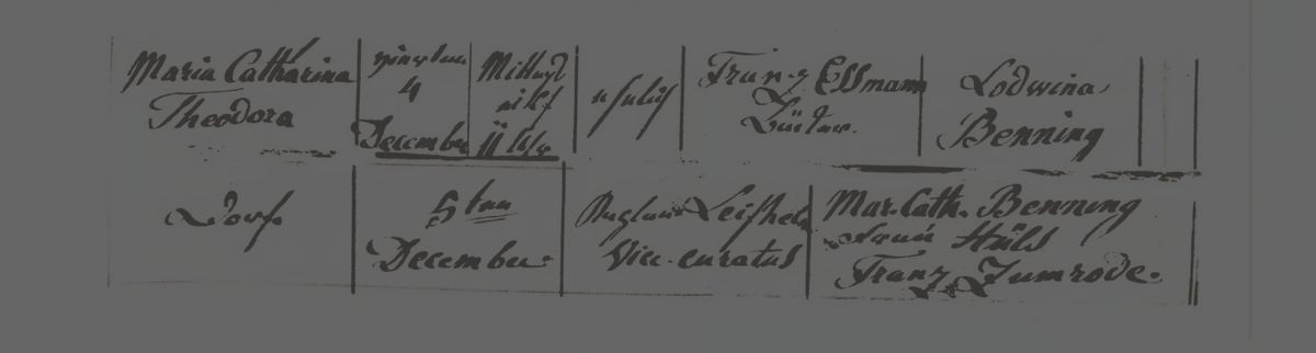Franz Essmann (* 30.05.1820), der „Bäcker im Dorfe“ Altenberge, heiratet Lodwina Benning. Sie eröffnen in ihrem Haus in Nordwalde, zentral neben der Kirche, eine Bäckerei mit kleinem Kolonialwarenladen und haben sich damit den Traum von Selbständigkeit erfüllt.